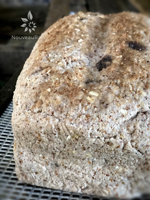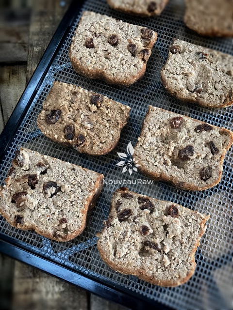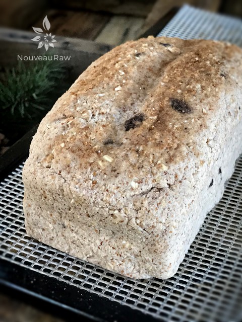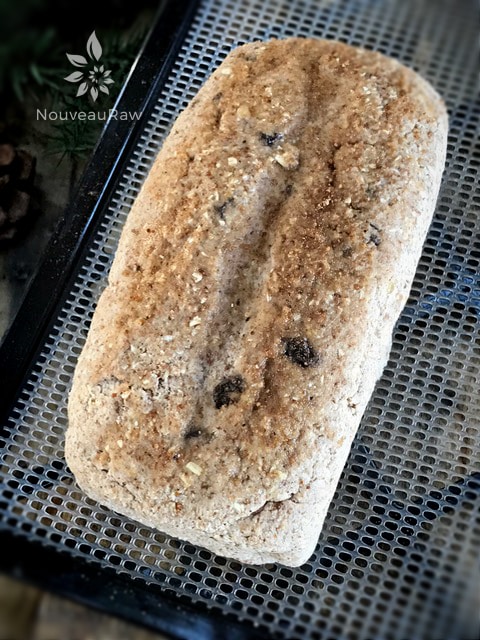 a close up slice of raw vegan gluten-free Sunday Morning Bread on a dehydrator trayIngredients:
