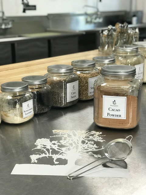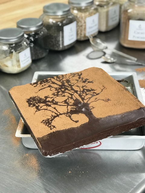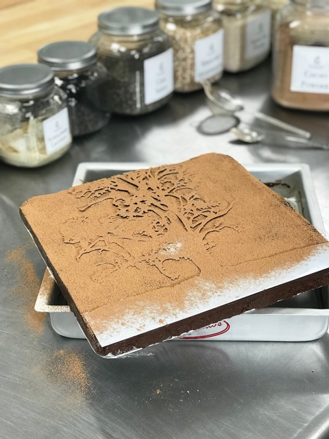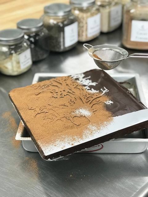 2. Once in place, dust the top with raw cacao powder. Be sure to use a thick enough coat to cover the edges of the stencil.