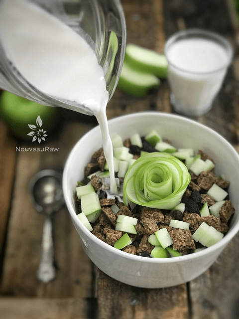 The beauty of this cereal is that it can be enjoyed with your favorite nut milk, eaten dry as a snack, crumbled over a bowl of raw ice cream or yogurt, use as a topping on your favorite raw pie, or tossed together with nuts and dried fruits for a healthy trail mix.
