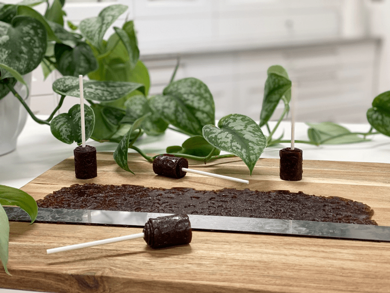 - Place the lollipop stick at one end and evenly roll the fruit leather to the other end.