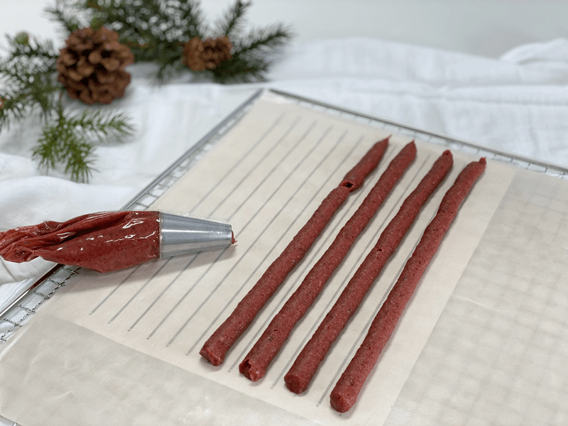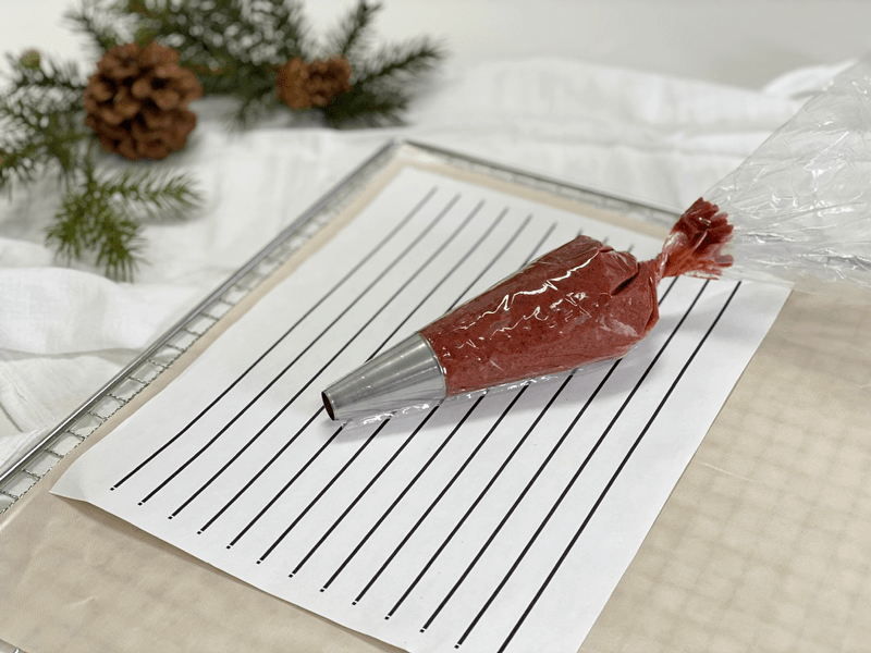 - Hold the piping bag tip about 1/4″ above the reflex sheet, at a 22.5-degree angle, and slowly guide the lines of batter down the sheet. Don’t hold it to high, or you will create a squiggly line.