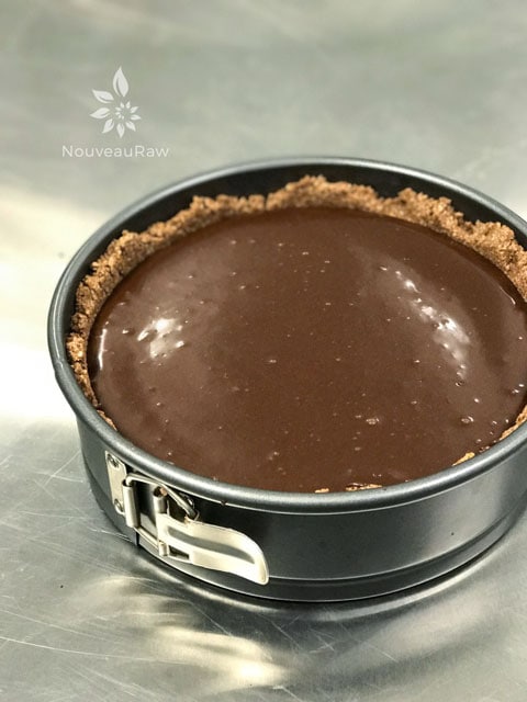 - After the cheesecake starts to firm up, pour the ganache on top and gently spread across the top of the cheesecake.