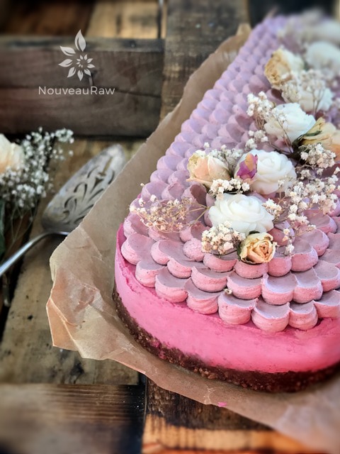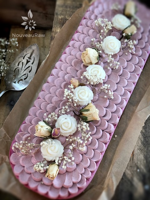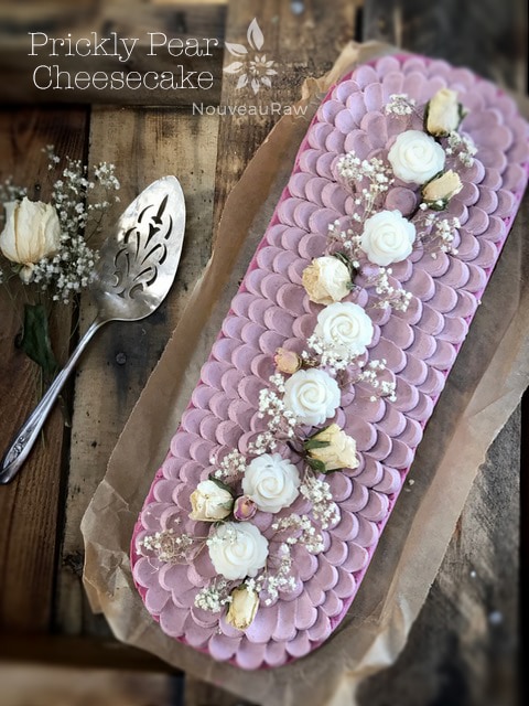 On top of the frosting, I created coconut butter roses with (this) mold. I simply softened the coconut butter, poured it into the mold, and slid it into the freezer to quickly harden. So easy and so pretty. I then added some edible roses and garnished it with dried babies breath. This cheesecake can be served frozen or thawed (and anywhere in between). We prefer it thawed about halfway. I hope you enjoy this recipe and have the opportunity to try prickly pears out. If you, do please comment below. :)