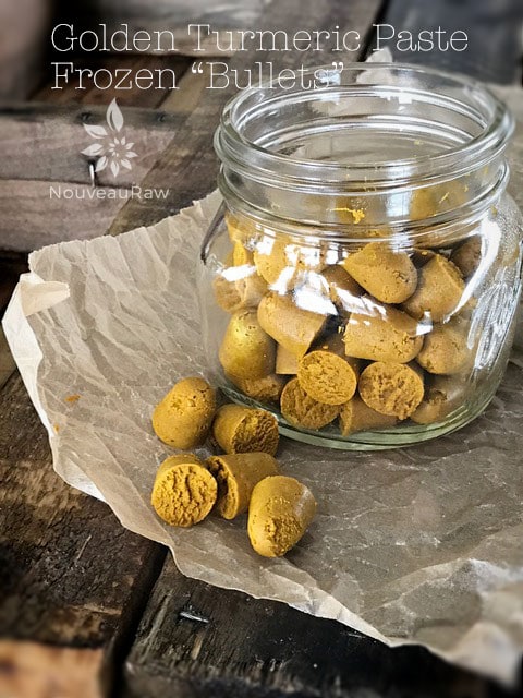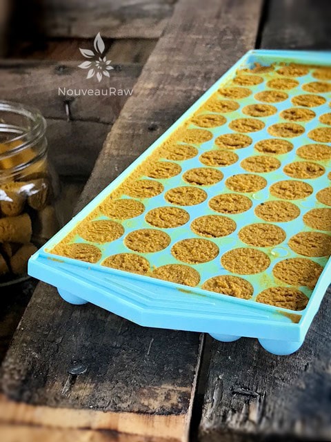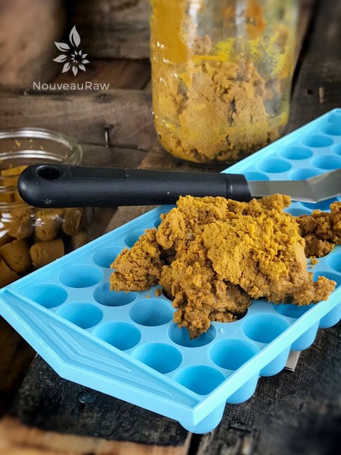 Ingredients:If you find yourself in a position where you have a lot on hand or perhaps you are heading out on vacation and don’t want your paste to go bad… I have an idea for you that I have been doing… Freeze it in little “bullet” shapes. This is an ice cube tray, and each little bullet is a teaspoonful’s worth. Once frozen, pop them out of the tray and put them into a freezer-safe container.