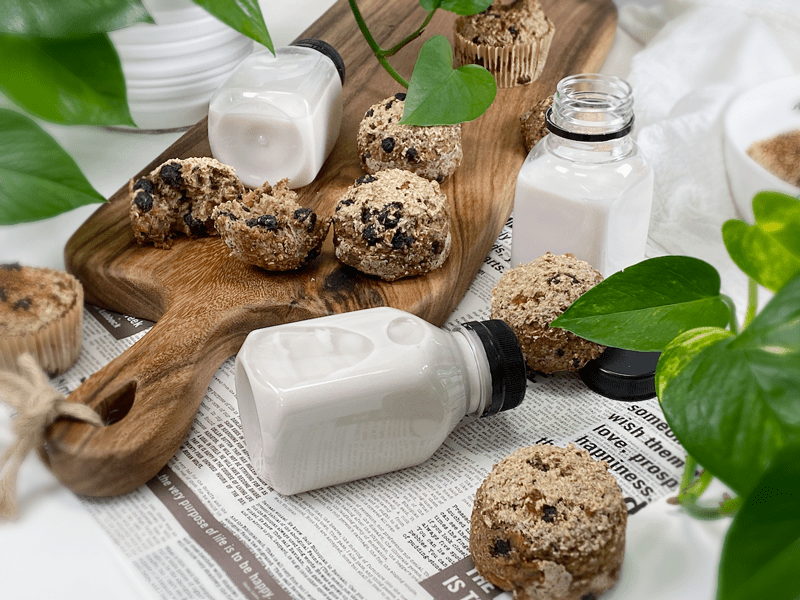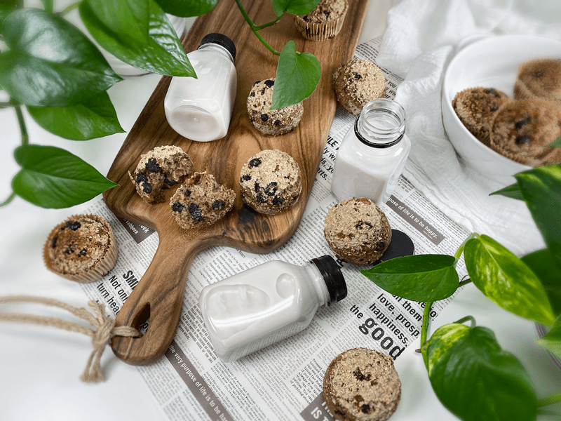 - Add the dried fruit, baking powder, and baking soda, process 10 seconds, and immediately pour the batter into the muffin pan and bake for roughly 45 minutes.