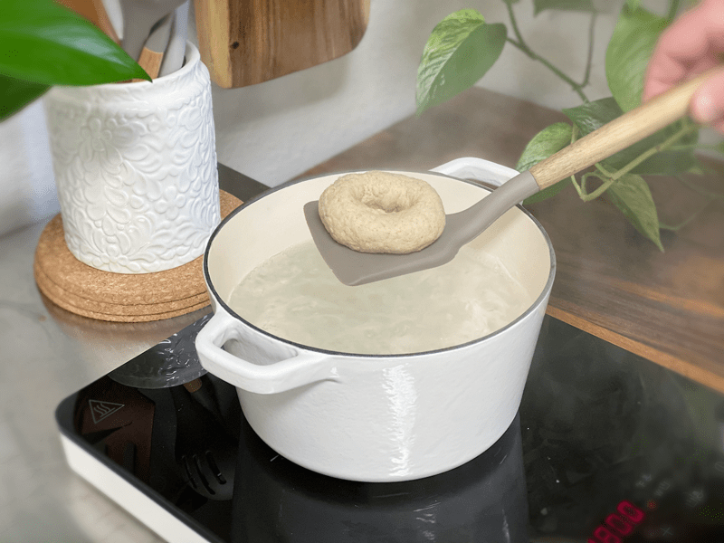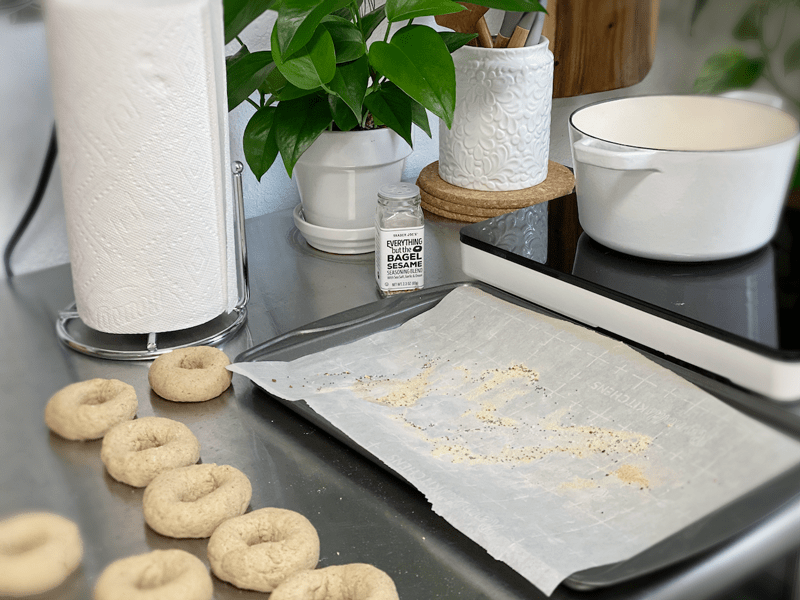 Gently place the bagel into the water and let it boil for 60 seconds or until it floats to the top. Remove, place on baking sheet, and add seasoning.