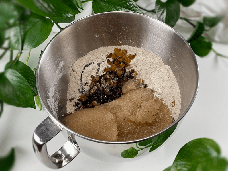 - Add the psyllium gel, molasses, and raisins around the bowl.