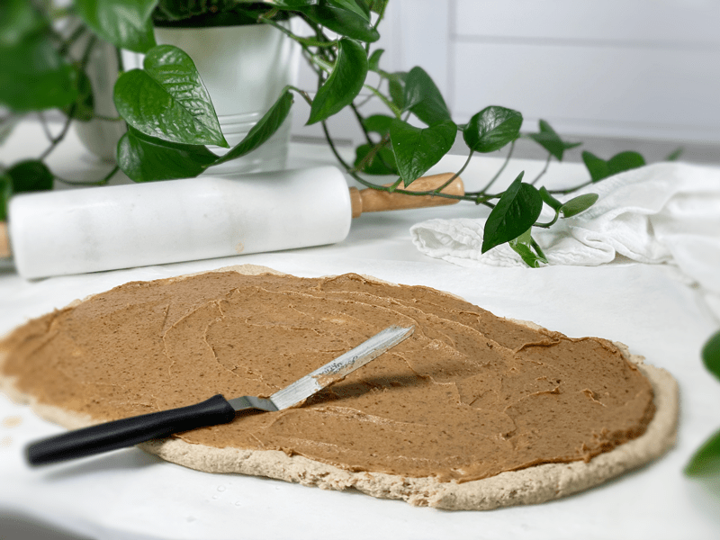 - Place the dough on a piece of parchment paper and roll it out into a rectangle. Mine measured 15″ x 11″ x 1/4 ” thick.