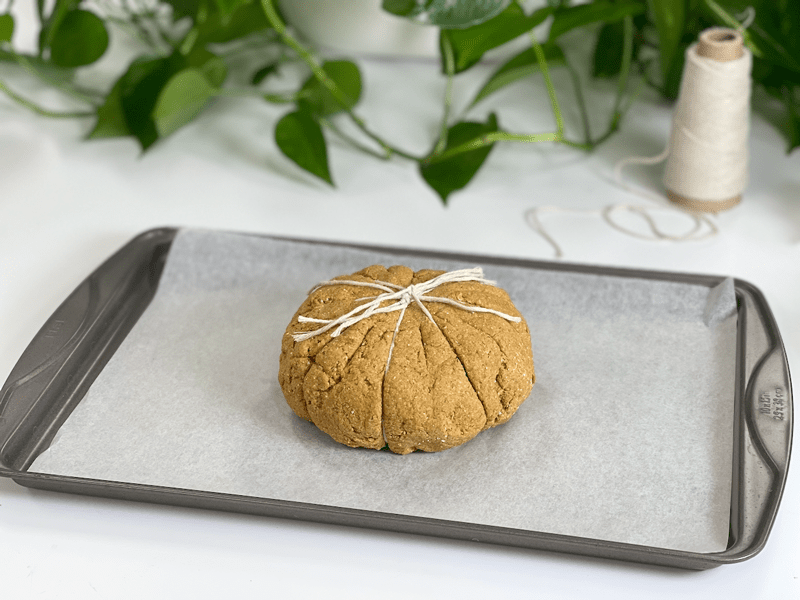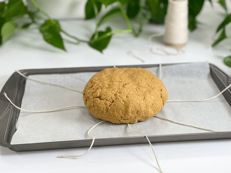 - Shape the dough into a ball shape, slightly flatten it and place it on the center of where all the strings intersect, then one string at a time, tie the ends of the string up over the dough and secure in a knot. Repeat until all the strings have been secured around the dough. Do not tie the twine too tightly.