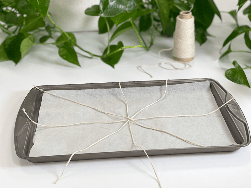 - Cut four 18-inch-long pieces of kitchen string/twine and lay them in the center of the baking pan, crisscrossing at the center to create a star-shaped pattern.