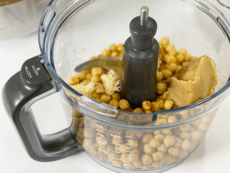 - In a food processer, fitted with the “S” blade, combine the chickpeas, miso, garlic, lemon juice, cumin, coconut aminos, and vegetable broth. Puree to a texture that you like, chunky or extra smooth.