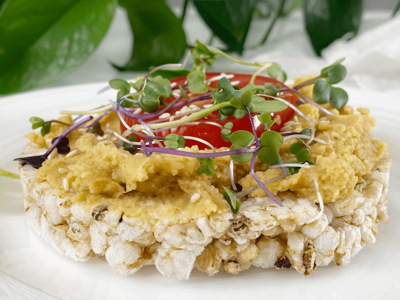 Mid-afternoon snack: rice cake with hummus, fresh slice of a garden tomato and micro greens. Delicious combination.