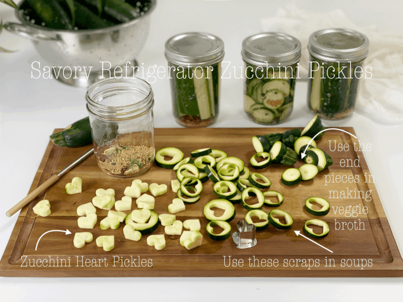 If you have little ones, I encourage you to get them involved in making these pickles. Select some cookie cutters that fit within the diameter of the zucchini and have them make some fun-shaped pickles. If you have fun with this, don’t worry about waste. Use the leftover scraps in your next salad or soup. You can even save the end pieces. Place them in a ziplock back and pop in the freezer. Anytime you have any leftover veggie scraps, toss them into the same bag. Once you have about 4 cups on hand, simmer them in water to create a vegetable broth.
