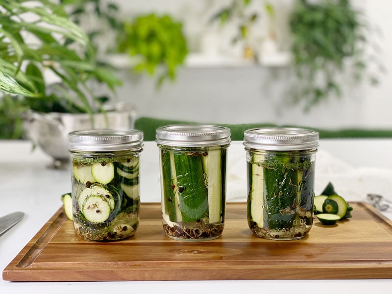 Pour the brine into the jars over the zucchini, leaving about 1/2″ of headspace. Tightly secure lids and gently shake the jars.