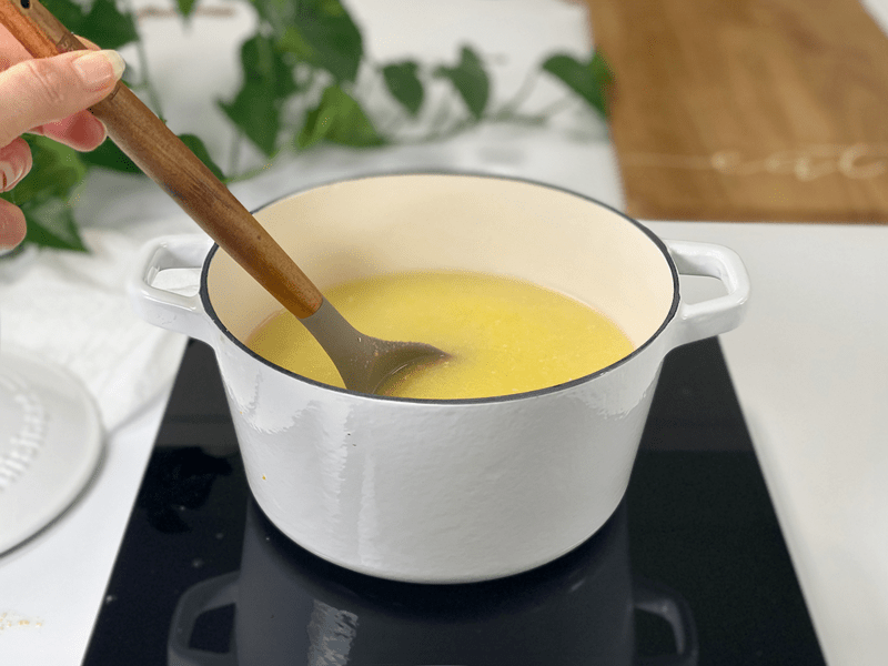 3. Reduce the heat as soon as it starts to show the first signs of spitting, keeping the heat low enough so that the polenta won’t puff, pop, and spit as it cooks.