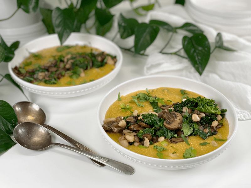 Cheesy Vegan Polenta with Mushrooms and Wilted Kale | Oil-Free