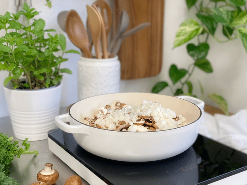 - In a medium-sized pan on medium heat, water sauté the cremini mushrooms and diced onions (sprinkle with salt).