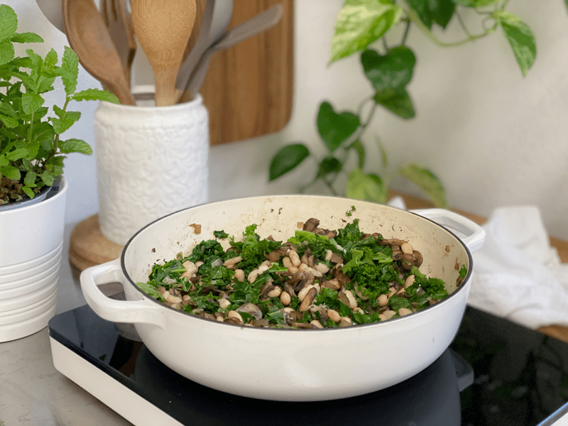 Now put the cover on and let it cook on low heat for roughly 5 minutes… just until the kale softens and the beans are warm all the way through.