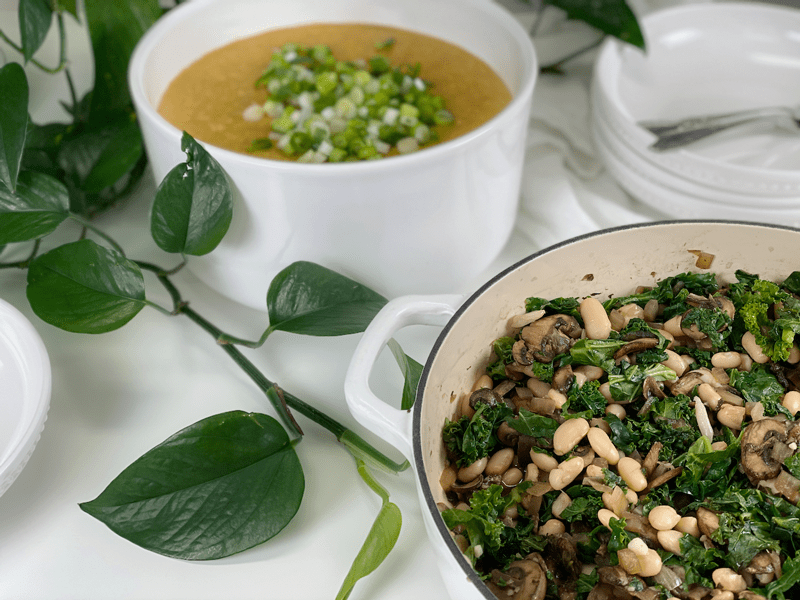 When Bob and I sat down to enjoy a bowl of this Cheesy Vegan Polenta with Mushrooms and Wilted Kale, we were taken aback by all the layers of flavor and texture. The polenta coated our mouths with a rich, creamy umami (a pleasant savory taste). We can thank the vegetable broth, nutritional yeast, and kombu seaweed for that. The sautéed mushrooms had a meaty, toothsome texture; the beans gave a subtle pop of creaminess against the earthy, gentle tenderness of the kale. It was a pure culinary delight.