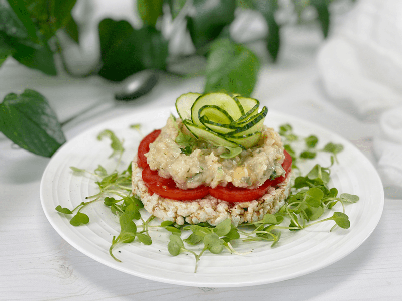 - It also tastes amazing on a rice cake. I created a thin layer of ripe garden tomatoes, spread some chickpea salad on it, and topped it with a cucumber flower. I had that for lunch, too.