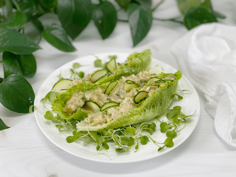 - Create lettuce boats, filling them with the chickpea salad; add some thinly sliced red pepper, and maybe some cucumber. I had three of those for lunch.