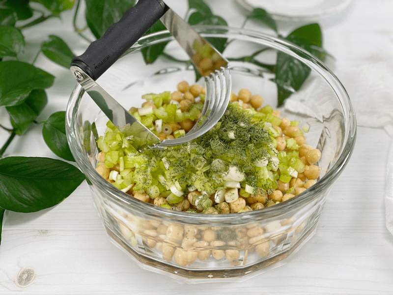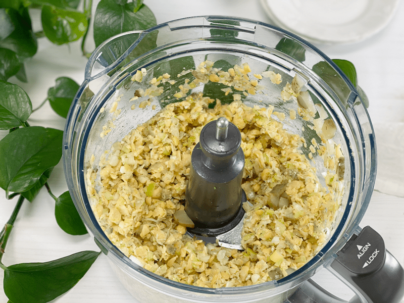 - In a large bowl or food processor, fitted with the “S” blade, combine the chickpeas, pickles, celery, onions, dill, black pepper, and parsley. Set aside