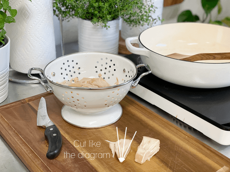 Make sure to strain the jackfruit and cut it into thin smaller pieces, cutting through the tougher core.