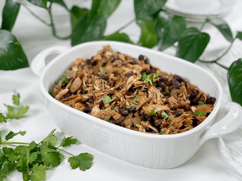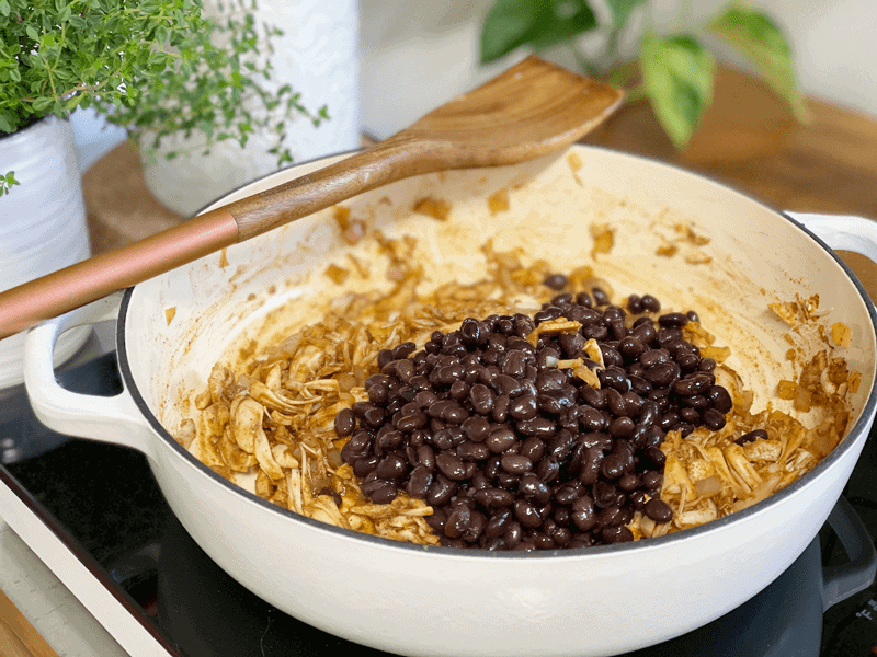 Add the shredded jackfruit, 1/4 cup more broth, lemon juice, coconut aminos, all the spices, and drained black beans to the pot and cover. Reduce heat and let it simmer until the jackfruit softens slightly (roughly 5 minutes).