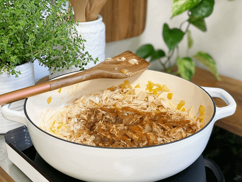 3. Add the shredded jackfruit, 1/4 cup more broth, lemon juice, coconut aminos, all the spices, and drained black beans to the pot and cover. Reduce heat and let it simmer until the jackfruit softens slightly (roughly 5 minutes).