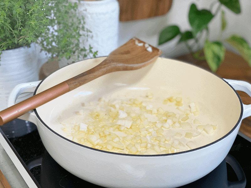 It’s normal to have to add more broth during the sautéeing process, but if the onions are sticking, that means your heat is too high.