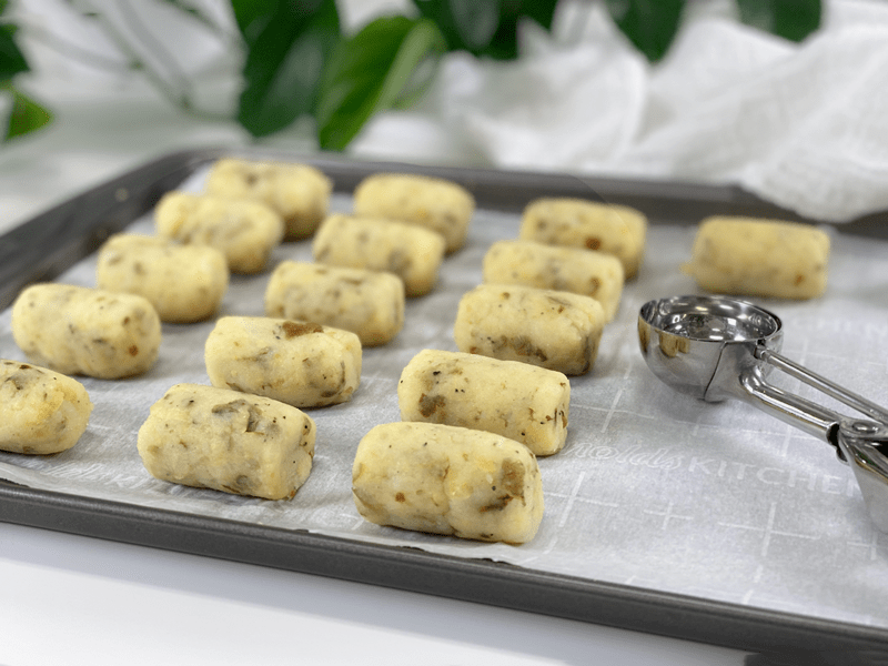 - Using a 1 tablespoon cookie scoop, place a level scoop into your hands and form into tater tot shapes. Place them on the baking pan.