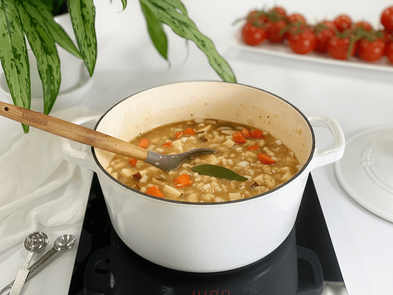 - Puree half of the soup to achieve a slightly more silky texture by placing half of the soup mix in the blender, then mixing it back to the pot. Or you can use an immersion blender if you have one.