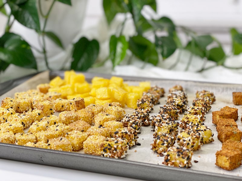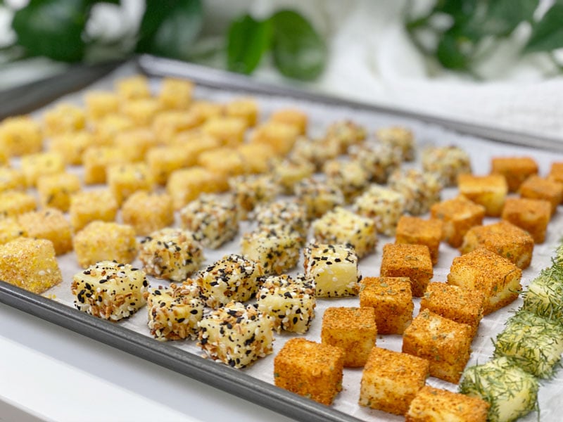 - As you are individually coating each cube, I found it helpful to rinse and dry off my fingertips a few times throughout the process. Due to the wetness of the polenta cubes, the seasoning starts to stick to your fingers and soon more will end up more on them than the cube.