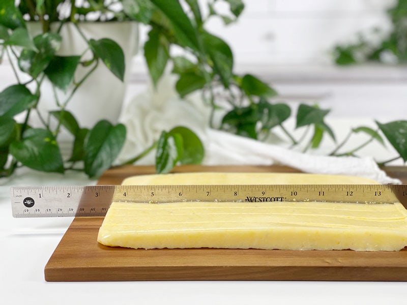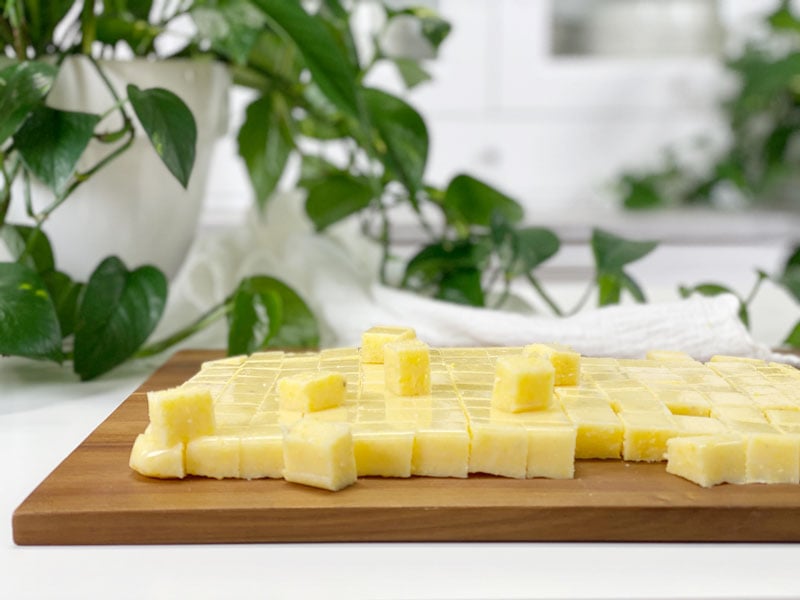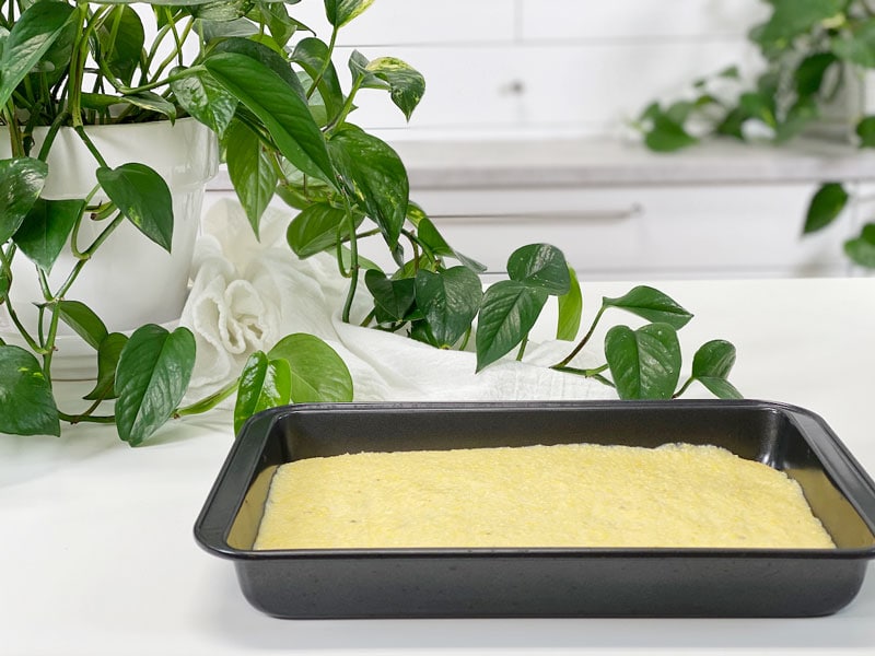 - Once it is set, flip the polenta onto a cutting board and remove the pan.