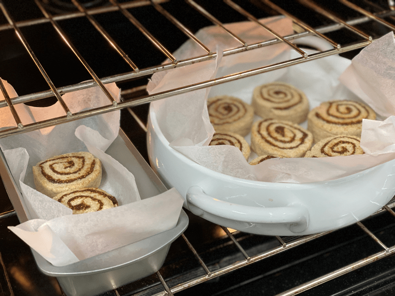 - Baking: Regardless of what type of baking dish or pan you use, make sure to line it with some parchment paper. Also, be sure to give a little space between each roll, since they do expand.