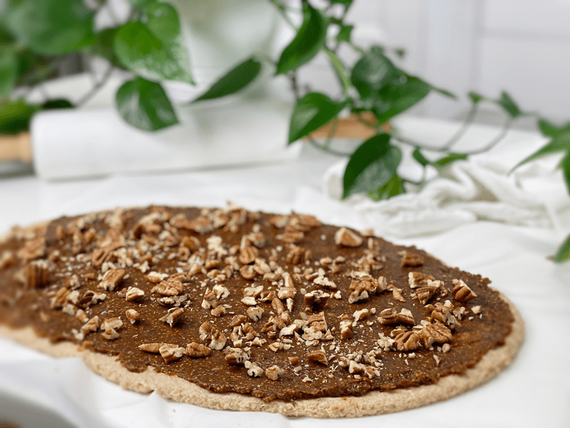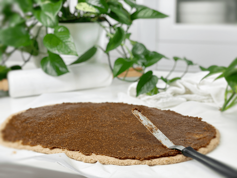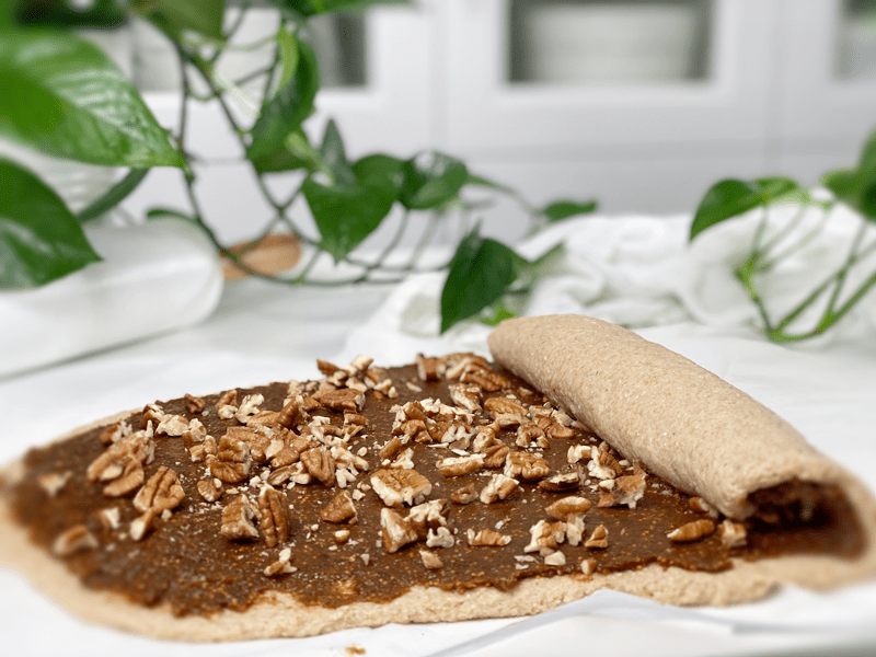 - Spread the fig paste, making sure to cover the entire surface. Sprinkle the chopped pecans on the fig paste.