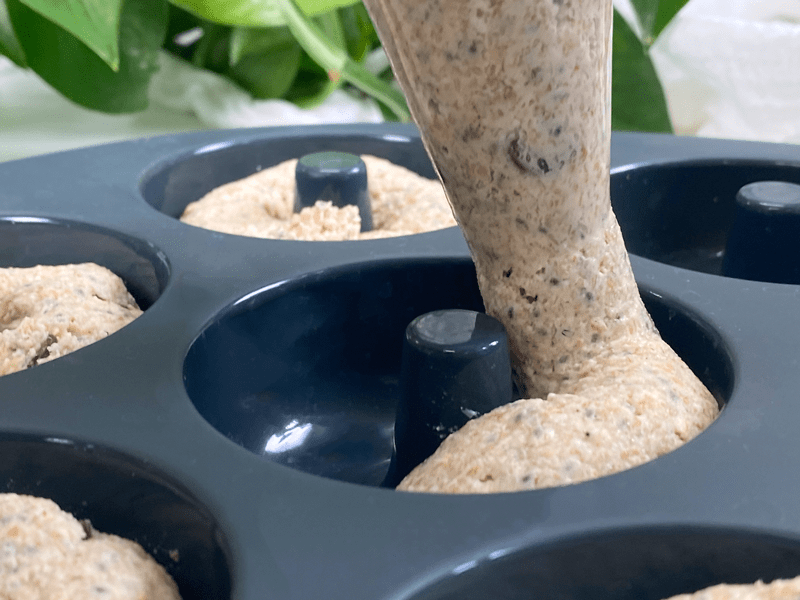 To make life easier, scoop the batter into a piping bag so you can pipe it into the doughnut mold.