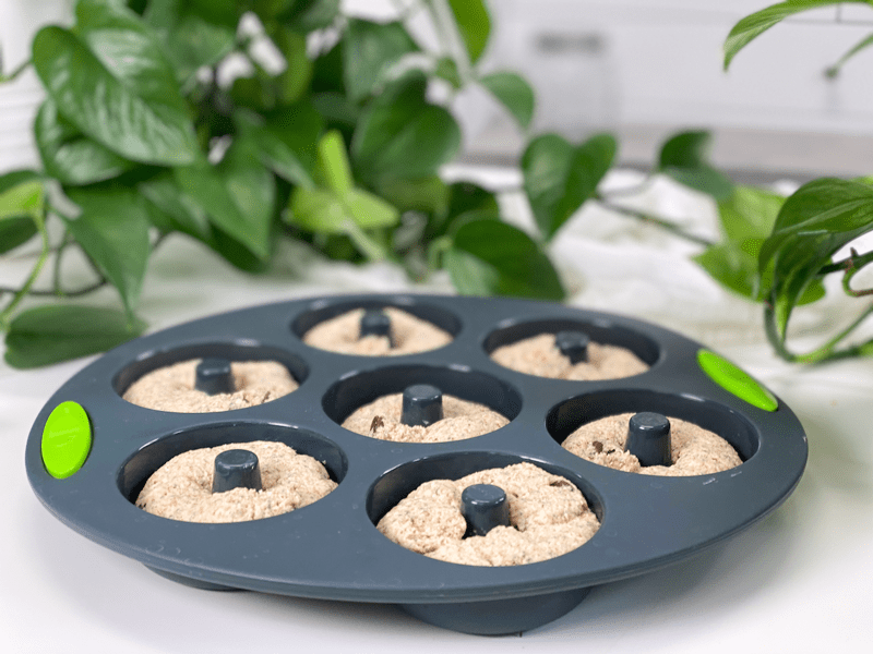 - I am baking in a silicone doughnut pan; therefore I don’t need any oil. One tip when using silicone baking dishes is to place them on a baking pan before loading and transporting them to the oven. Since they are soft and flexible, they can be challenging to handle once full.