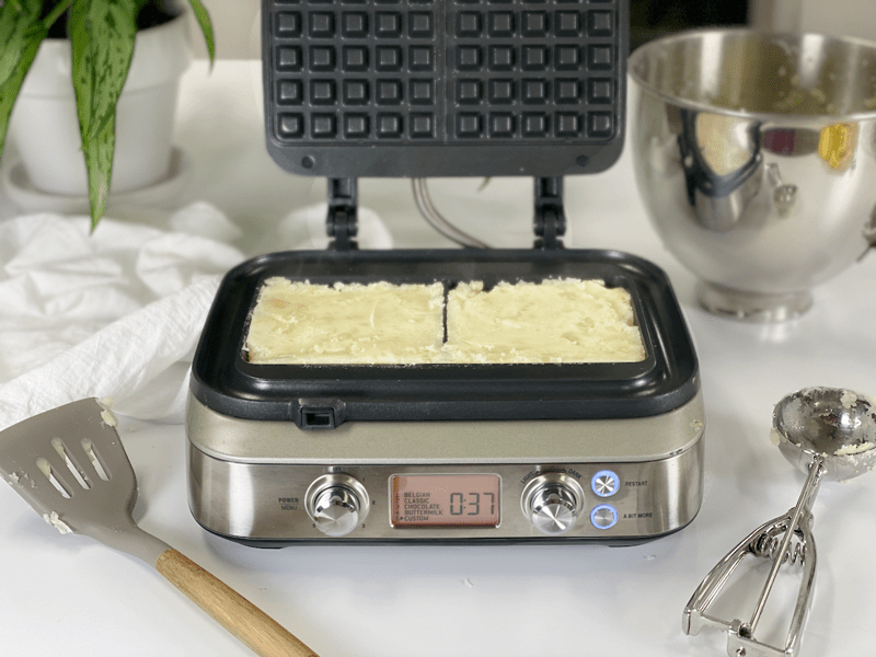 - Preheat the waffle maker. Once the waffle maker is ready, fill each waffle cavity with the mashed potatoes. Press down firmly, reaching all sides.