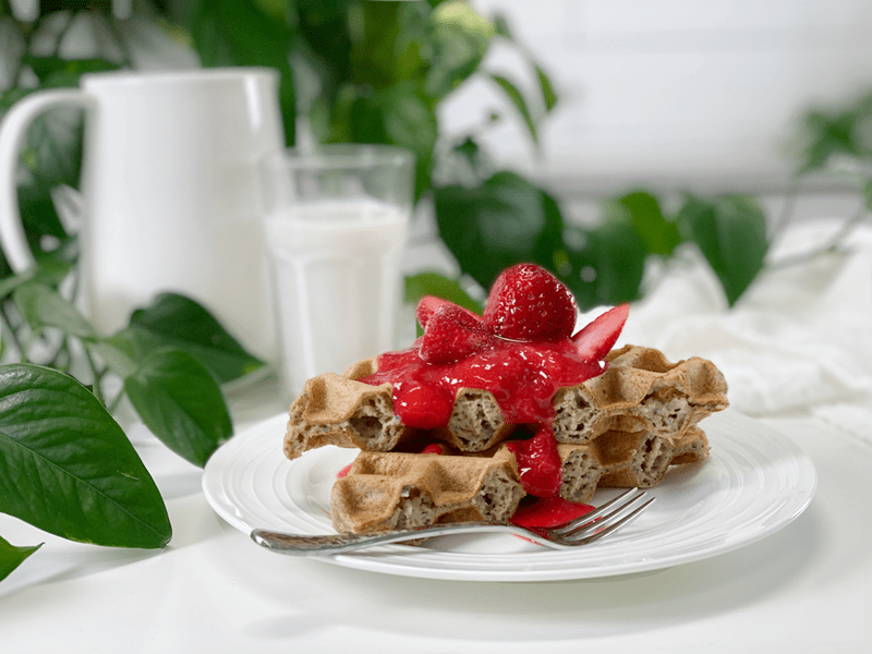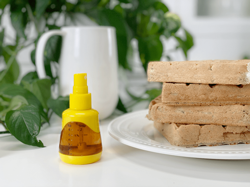Watching your sugar but want a little maple syrup? Here’s my trick… mix 1:1 ratio of maple syrup and water. Place in a spray bottle and spritz the waffles just to give you that hint of sweetness.