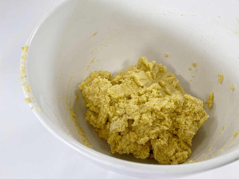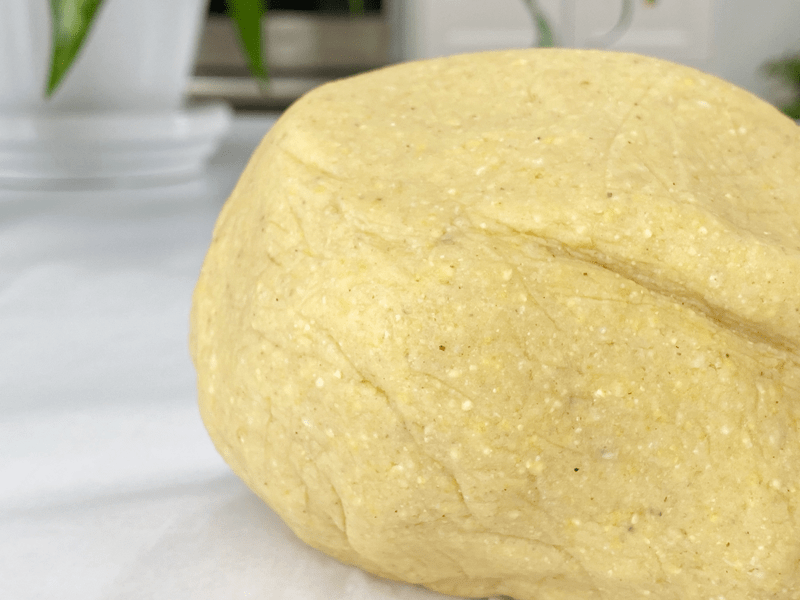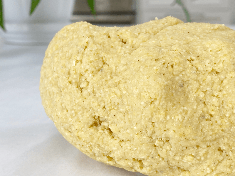 - In a medium-sized bowl, stir together the masa and hot water and mix with a spoon until the dough is formed. Then using your hands (once it’s cool enough to handle), knead the dough for 2 MINUTES, folding it over onto itself, over and over.