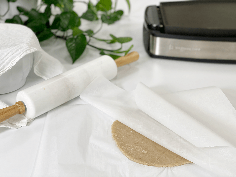 - Place the other sheet of parchment paper on top of the dough and with a rolling pin, flatten the dough in a circular shape until it is about 1/4″ thick or less.