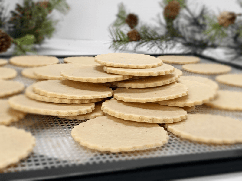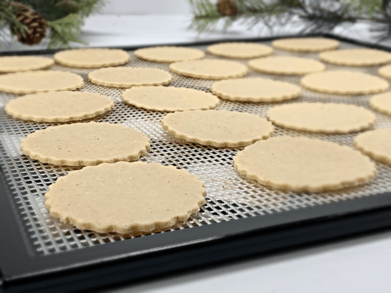 The key is to roll the dough out very, very thin. I will post a picture below where I pressed a cookie stamp into the dough after it was rolled out. The stamp didn’t punch through, but it made it so thin that the light could shine through when I held it up. It will take a gentle hand when transferring them from the rolled-out dough to the dehydrator tray, but trust me; it can be done. And should you mess up, no biggy, throw it back into the dough scraps and reroll it out.