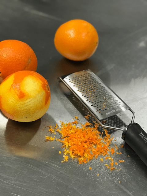 - When you are zesting the orange (or any citrus fruit in the future) use a gentle hand when doing so. You don’t want to press too hard and zest the white part of the rind. That part is bitter and can change the flavor profile in the end. So with a light hand, make one pass over the grater, rotate, and keep going all around the orange.