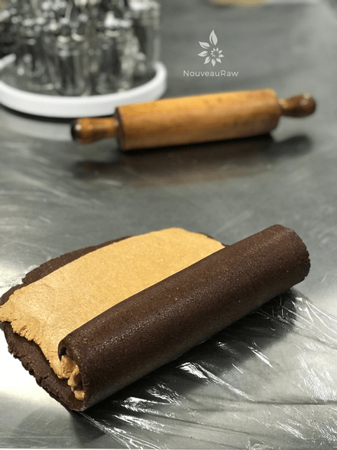 - Using the bottom non-stick sheet that the chocolate is rolled out on and start to roll the two batters together.