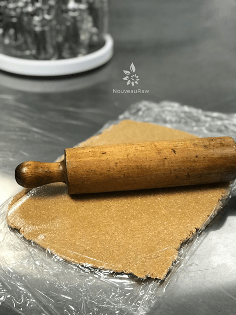 - Place the dough ball between 2 pieces of plastic wrap and roll out to 1/4″ thick.