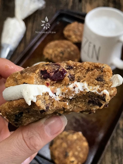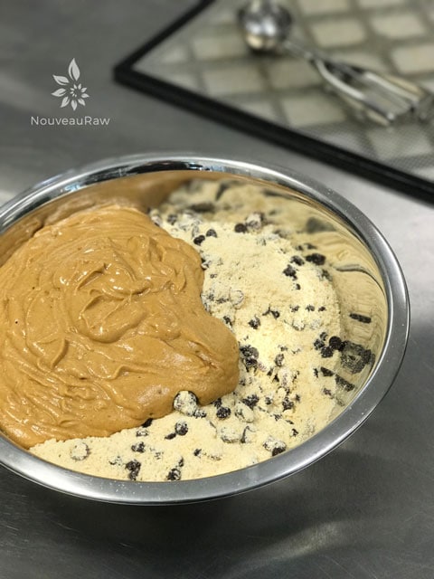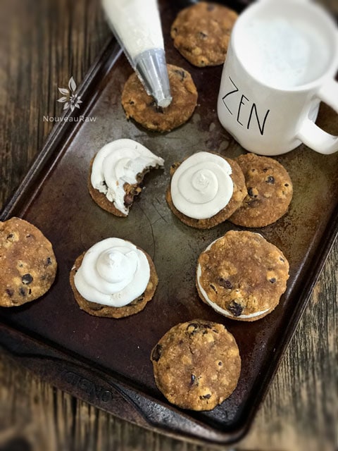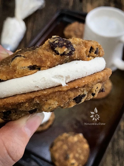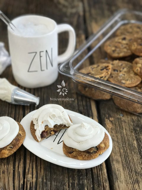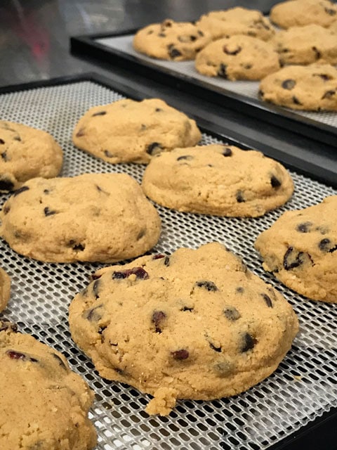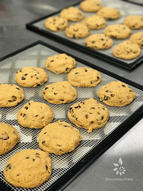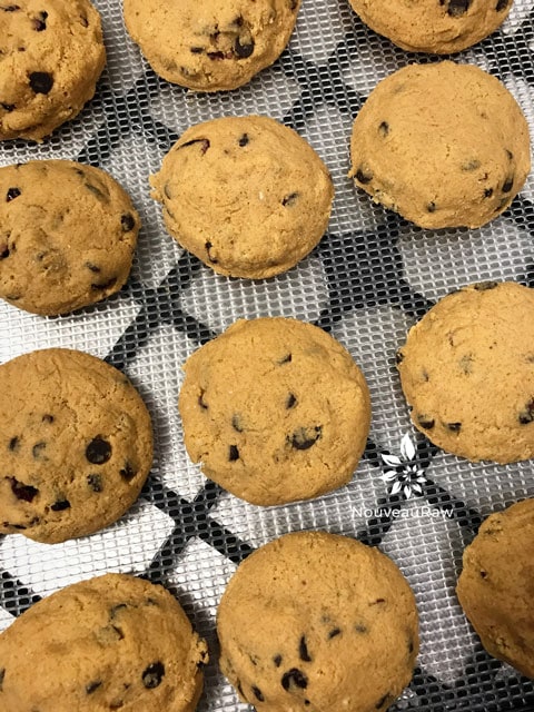 I want to touch base on the chocolate chips… You can use raw homemade chocolate chips or store-bought ones. If you use raw, you will want to push them into the cookie tops once they come out of the dehydrator otherwise they will melt during the drying process.