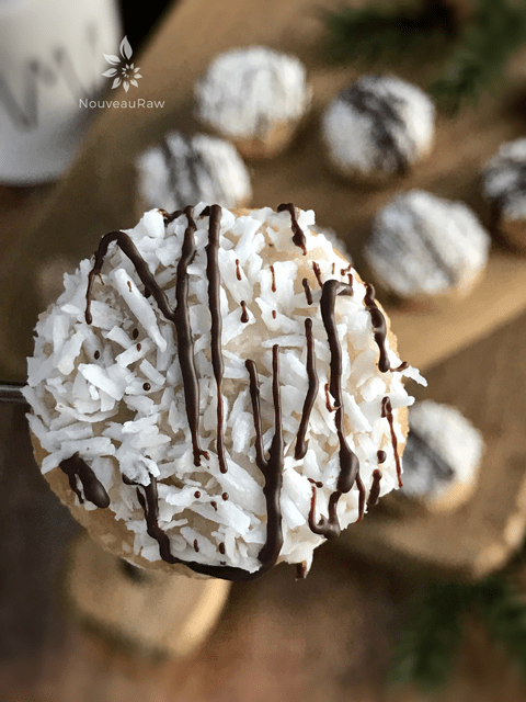 And then I made another variation. I mixed some of the vanilla icing with chocolate ganache and discovered a lovely chocolat mousse icing. My husband tried to eat it all! :) I topped some of the cookies with this chocolate mousse icing and garnished them with a few cacao nibs. Again, I could have piped them for a prettier cookie. Also, the chocolate mousse icing reminded me of a pie filling, so I had the idea to use this cookie dough (minus much of the sweetener) as a pie crust and fill it with the chocolate mousse. I think that will happen for Christmas!