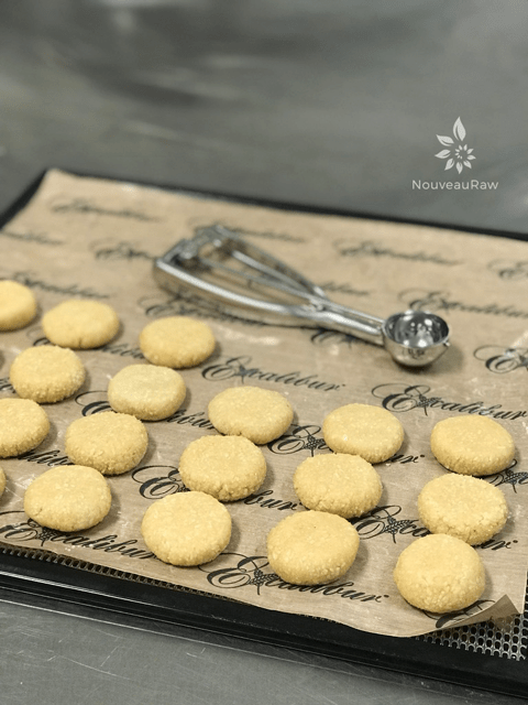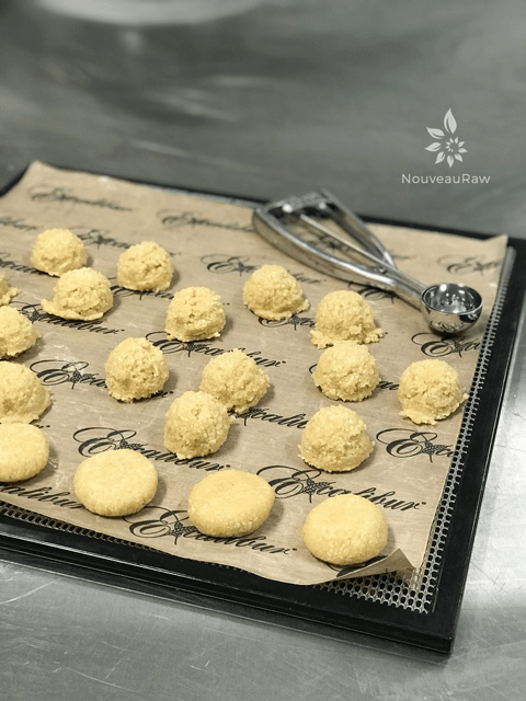 - Place the cookie on the teflex sheet that comes with your dehydrator. I made the mistake of placing them on the mesh sheet. It worked OK, but it was a bugger to get the cookies off of it. Please learn from my mistake. I sure did. :)