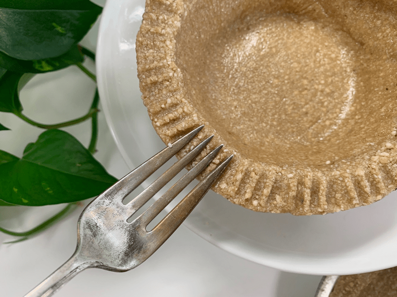 If using a pie pan and plan on serving it straight from there, I would lightly dust the pan with finely ground nuts or oat flour. If you use Springform pans or tart pans, wrap the base with plastic wrap. These little tricks will make it easier to remove a slice of pie.
